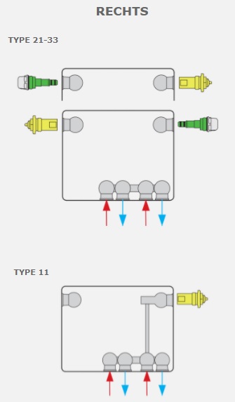 - Bij type 21, 22 & 33 kan thermostaatknop zowel links als rechts gemonteerd worden