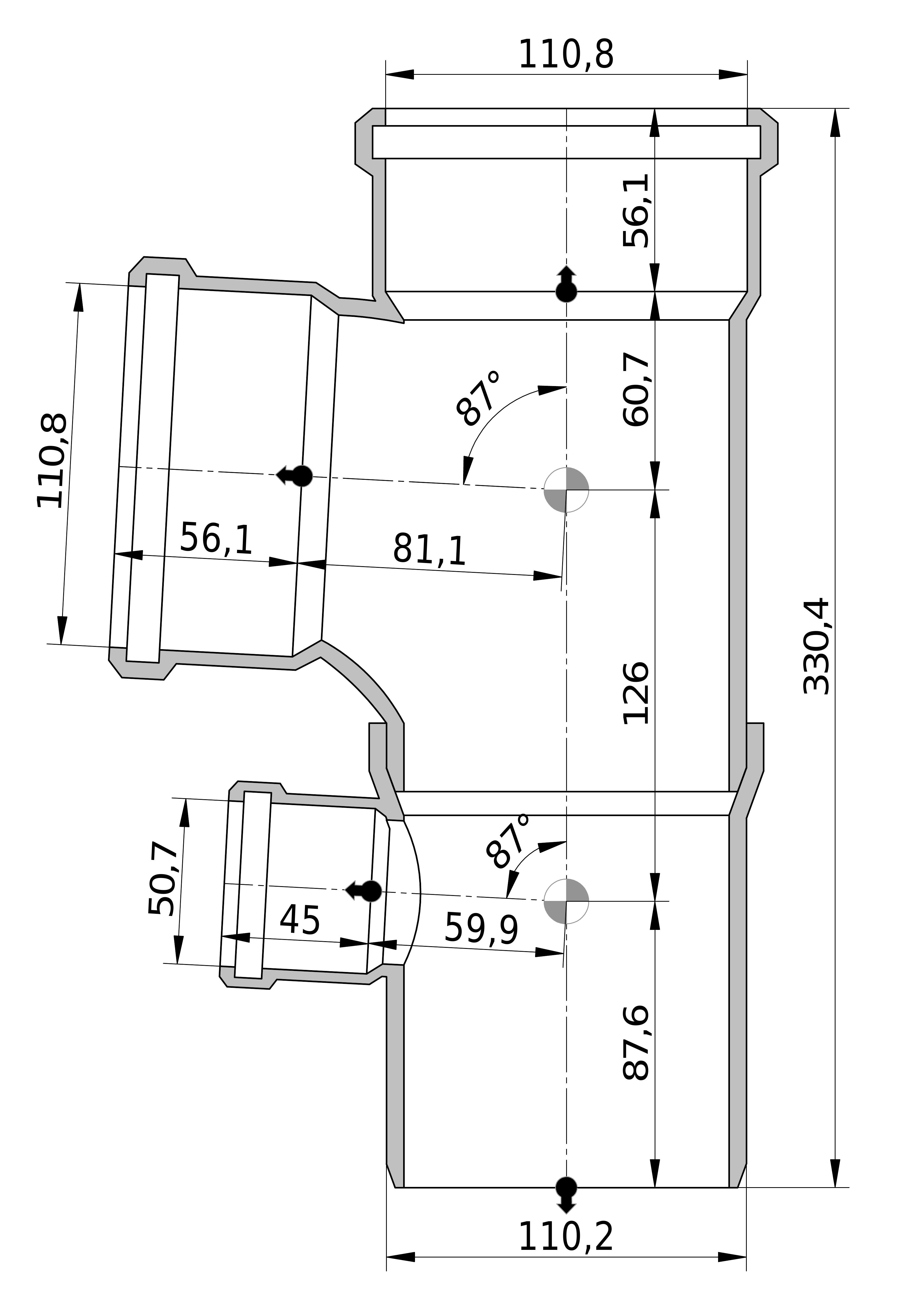 Dubbel Zij T-stuk PP AS+ geluidsarm lichtgrijs 87° 110x110x50mm Wavin