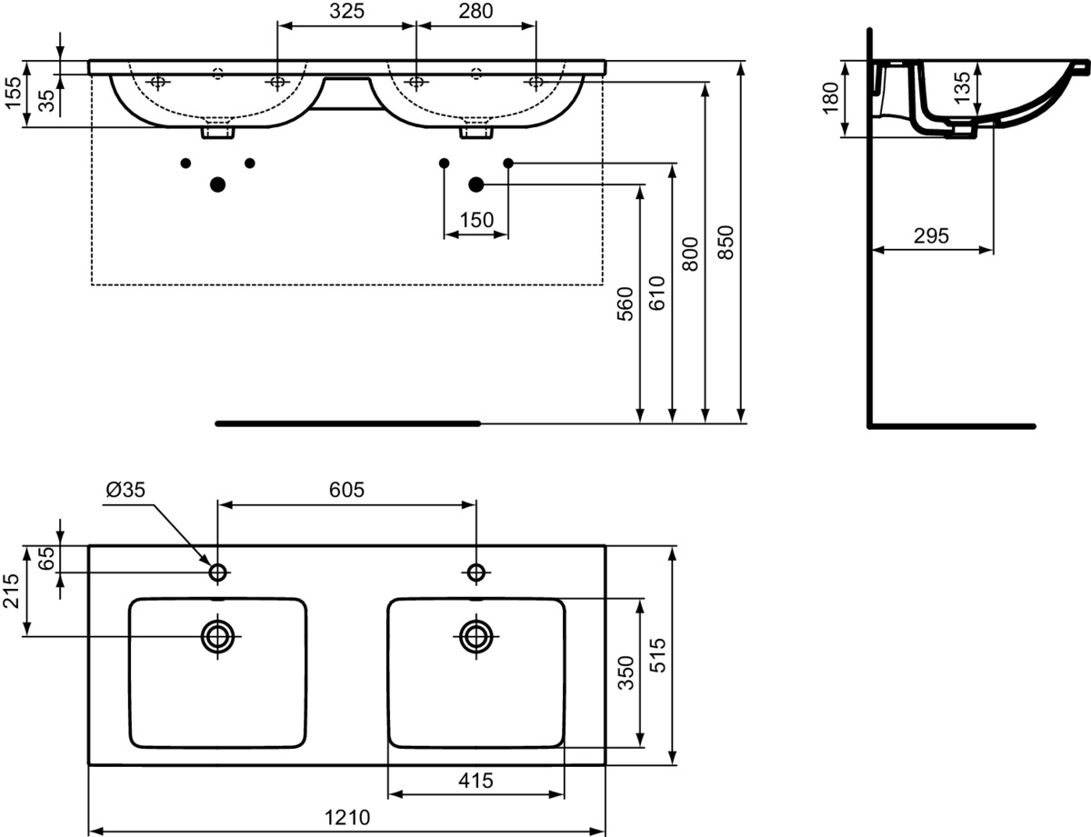 Dubbele wastafel I.LIFE-B VANITY dubbele wastafel 121x52cm 2x 1 kraangat midden met overloop wit Ideal Standard