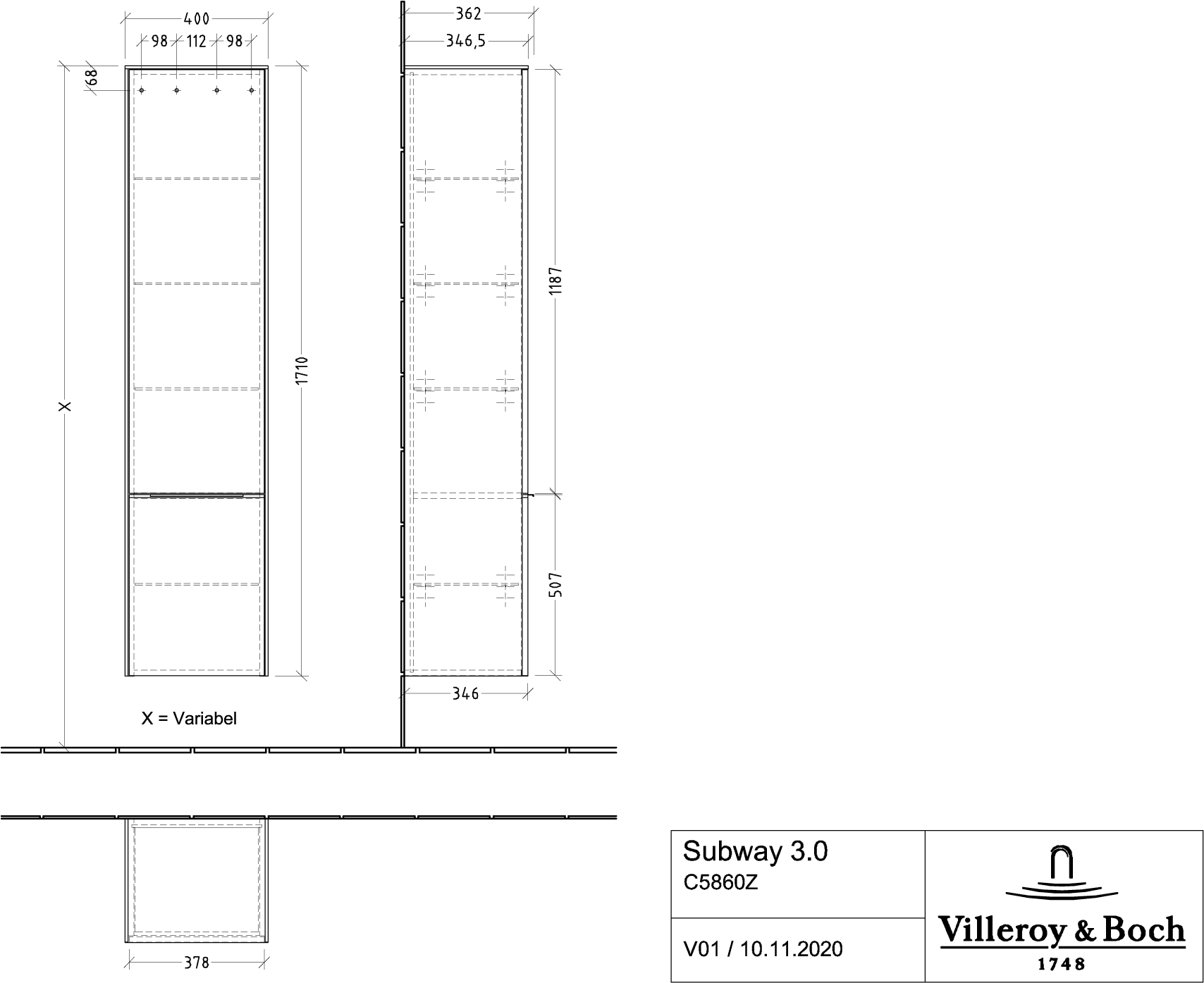 Hoge kast Subway 3.0 400 x 1710 x 362 mm Graphite C58601VR Villeroy & Boch