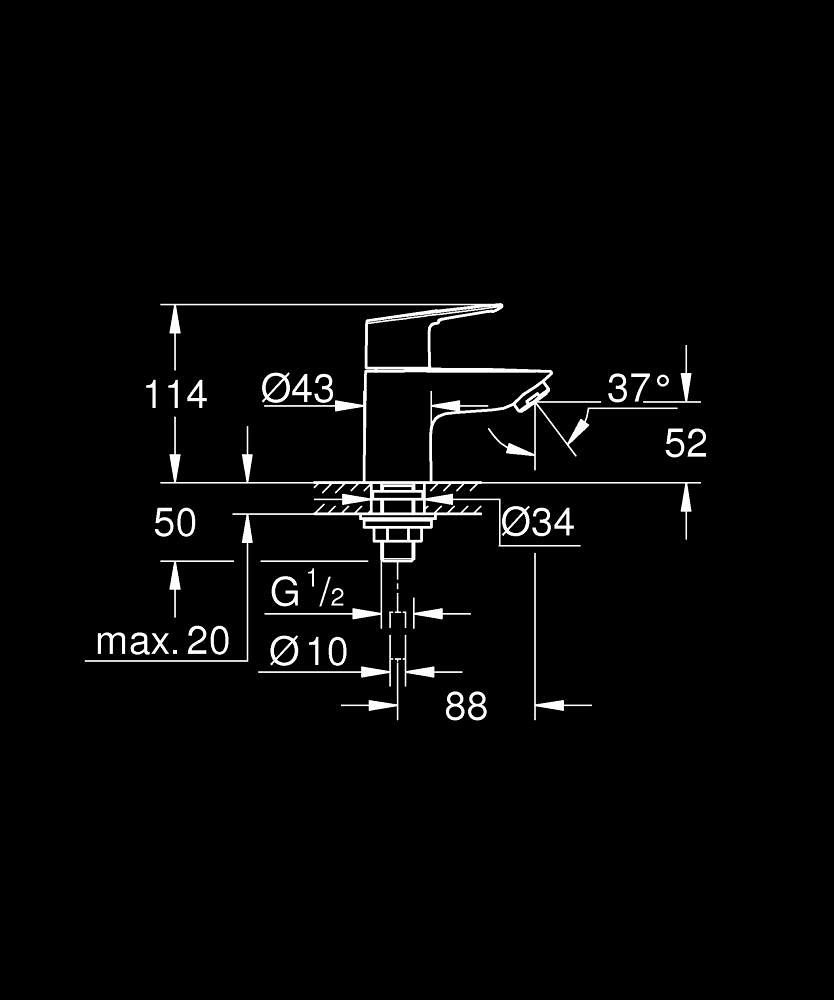 - Opbouwhoogte onderkant kraanmondstuk: 52 mm