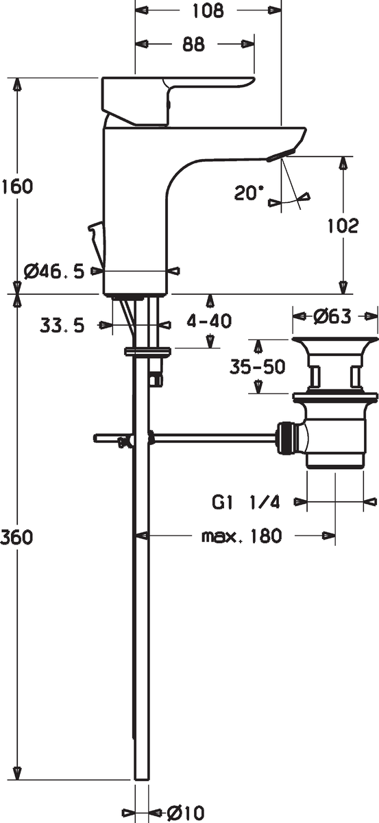 - Type afvoeraansluiting: Pop-up plug met verticale hefboom