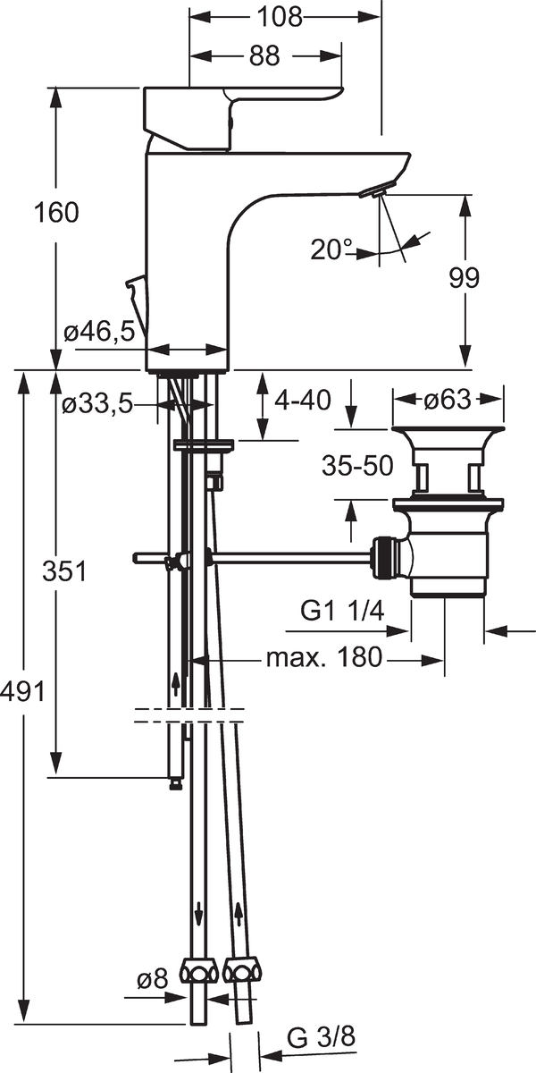 - Type afvoeraansluiting: Pop-up plug met verticale hefboom