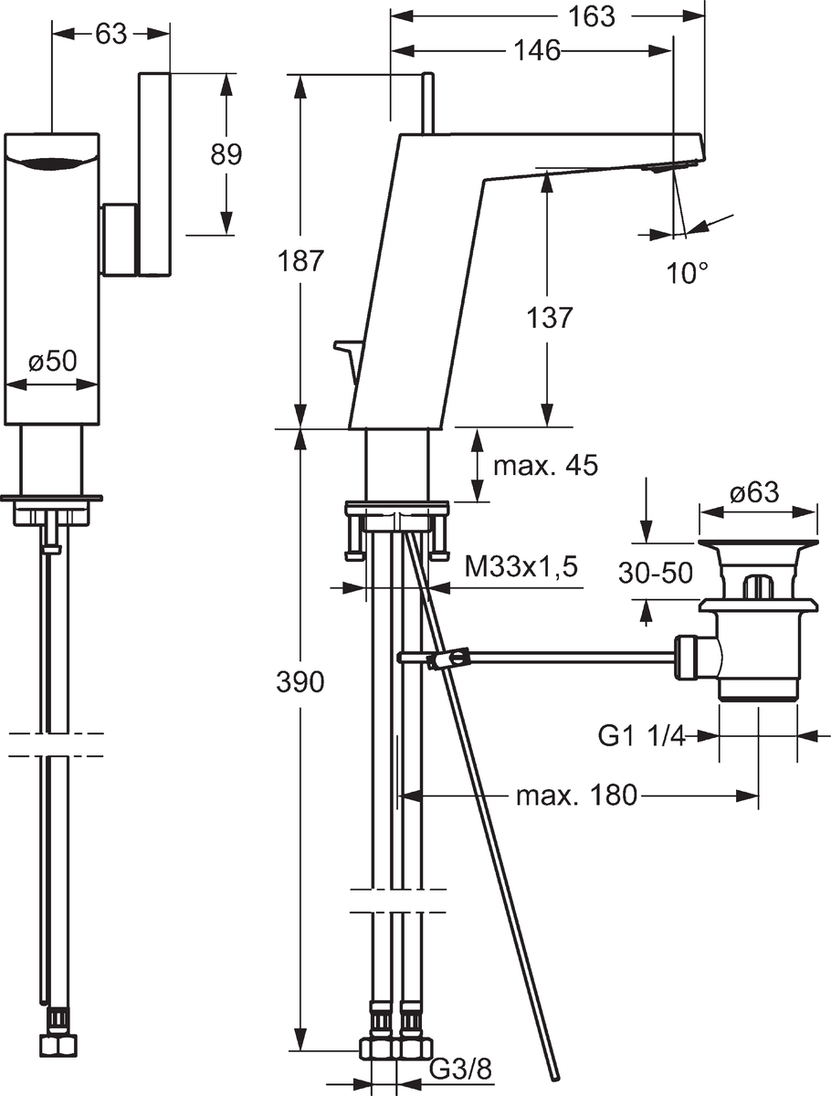 - Type afvoeraansluiting: Pop-up plug met verticale hefboom