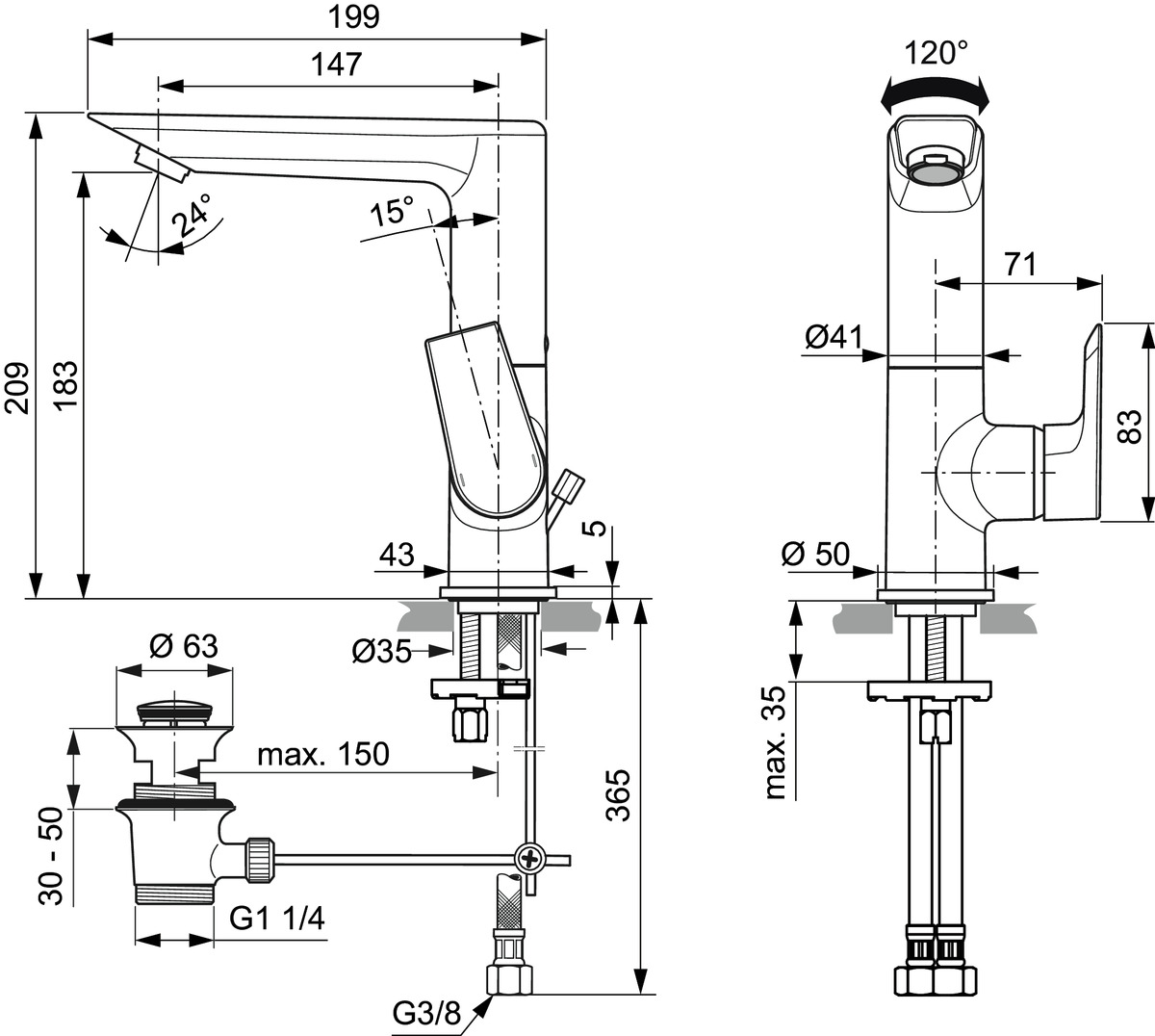 • Opbouwhoogte onderkant kraanmondstuk: 183 mm