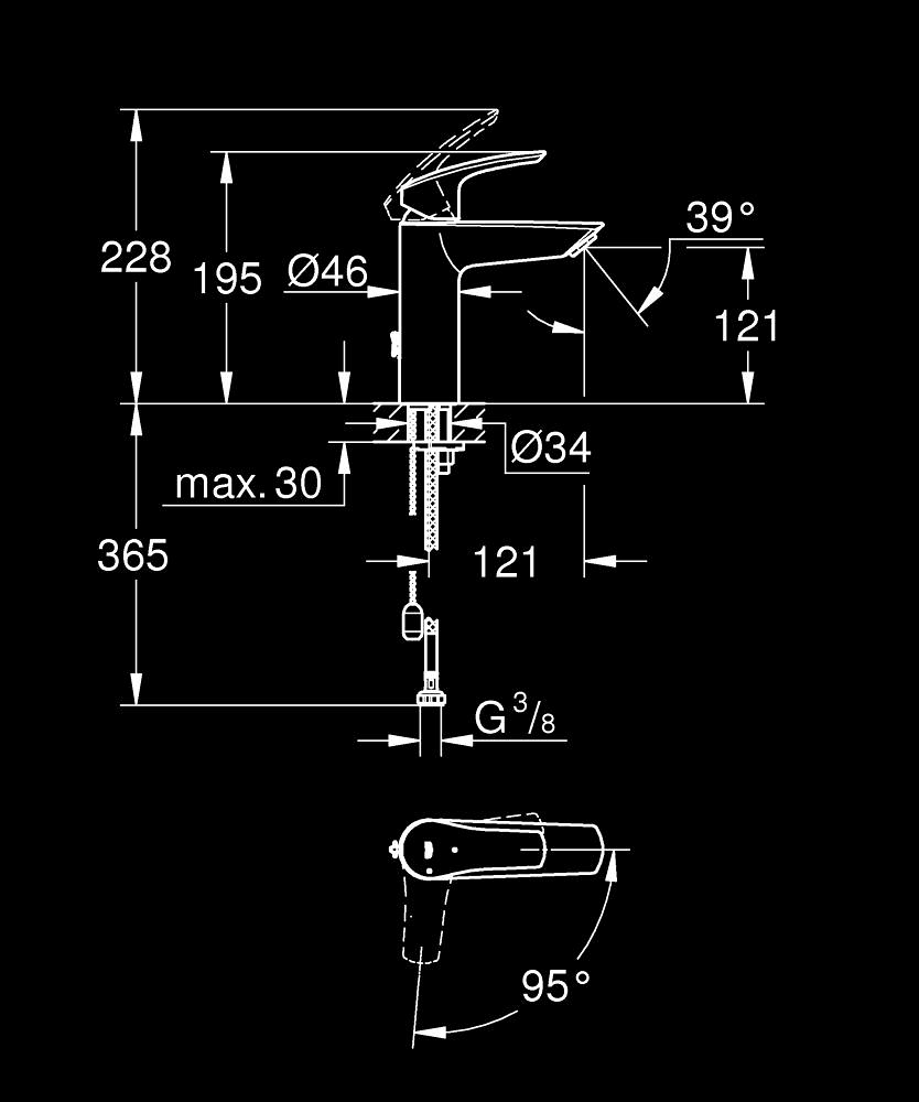 • Opbouwhoogte onderkant kraanmondstuk: 121 mm