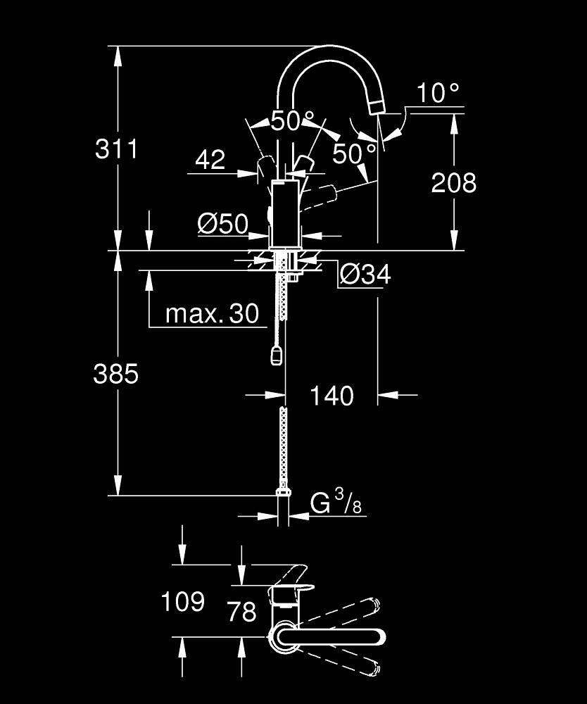 • Opbouwhoogte onderkant kraanmondstuk: 208 mm