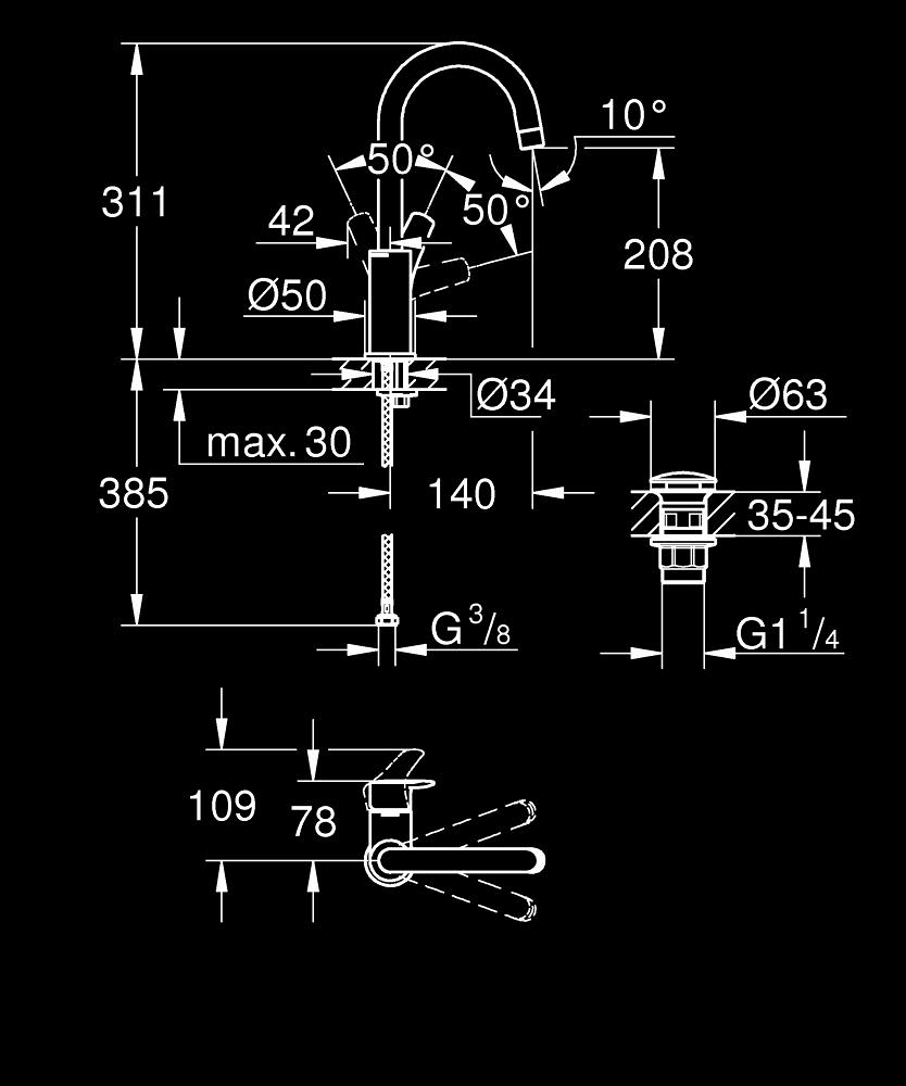 Eurosmart L-size wastafelmengkraan hoge uitloop incl. push-open plug 1.1/4" (prof) Grohe