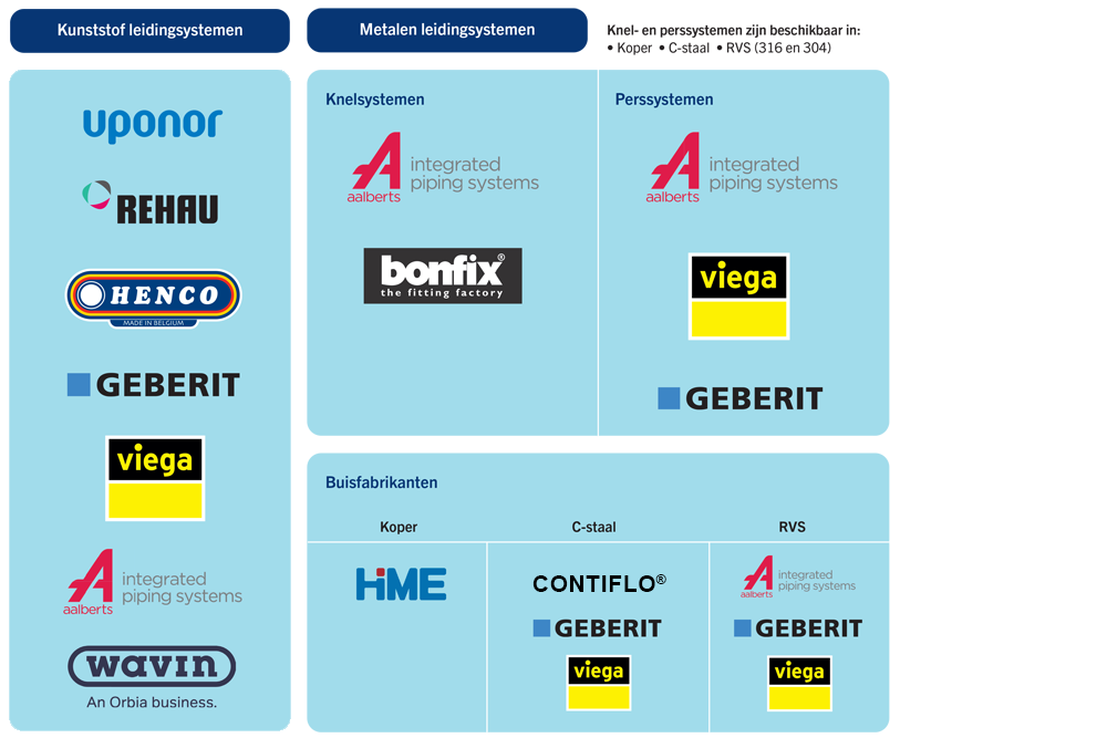 Het assortiment van Gévier sluit uitstekend aan op de merken en technieken die installateurs dagelijks gebruiken. Denk aan kunststof meerlagenbuizen van Uponor, Rehau, Henco, Geberit, Viega en Wavin. Of aan metalen leidingen van Bonfix, HME, Geberit, Viega en Aalberts Integrated Piping Systems (voorheen VSH). Ook op het gebied van koppelingen is er volop keuze: pers, knel of groef, in verschillende diameters en materialen. Alles direct uit voorraad leverbaar.