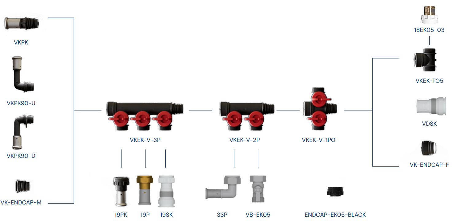 - Modulair systeem, door de vele combinatie mogelijkheden altijd eenvoudig een passende oplossing samen te stellen. Naar keuze met steek of persfittingen.