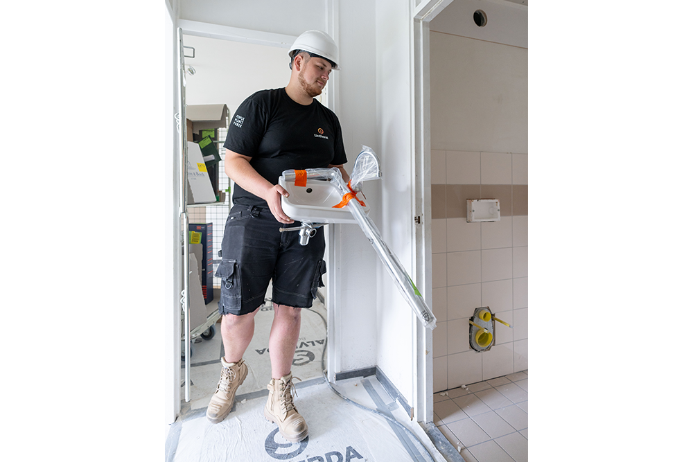 Wat houdt dat precies in? Buurman legt uit: “Per woning leveren we een rolcontainer met alle benodigde materialen: wastafels, kranen, fonteinen, inbouwreservoirs en klein montagemateriaal. Alles is vooraf geselecteerd, zoveel mogelijk voorgemonteerd en zonder overbodige verpakking.”